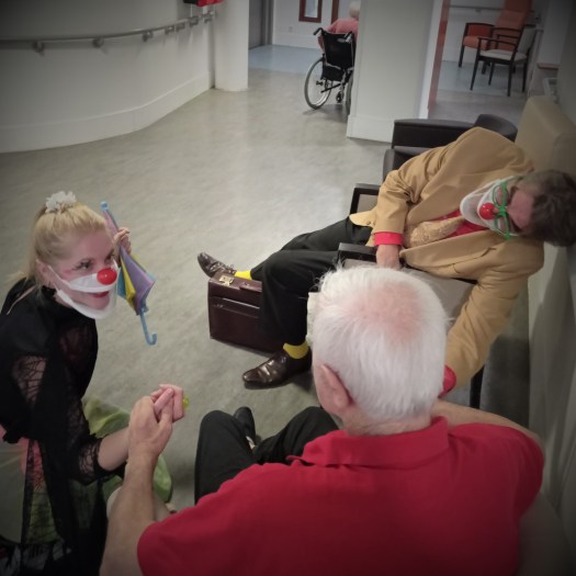 Avec les clowns, tout est possible, tout se joue dans l’instant présent auprès des personnes âgées et de l’entourage. Notre rôle est d’adapter le jeu à chaque rencontre, avec audace et délicatesse quand il le faut, de proposer un moment de rencontre, d’échange et de partage.