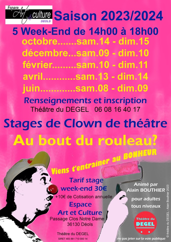 Le théâtre du DEGEL organise 5 stage de pratique du Clown de théâtre sur 2 après-midi de 14h00 à 18h00.